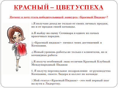 Кто хочет исполнить свои мечты? А получать большой доход? Кто хочет стать лучшей, какой она только может быть? Это о вас? И если ваш ответ «Да», то ваш выбор – стать победителем в конкурсе «Красный пиджак»!